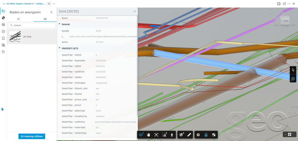 De module Geo-IT IMKL Import voorziet voor u een omzetting van de geïmporteerde attribuutinformatie naar AutoCAD CIVIL3D Property Sets. Dankzij deze conversie, zijn de nutsleiding gegevens ook raadpleegbaar in BIM software zoals NavisWorks en Autodesk Docs.